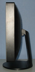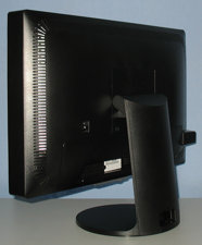 Die Lufteinlässe auf der Rückseite fallen recht groß aus, so dass vom Backlight angelockte Insekten ggf. leicht ins Monitorinnere vordringen können. Das Monitorgehäuse selber hat eine beachtliche Tiefe von 8 cm, ist also alles andere als schmal. Gehäuse und Fuß wirken aufgrund der Rundungen sehr organisch, Kanten findet man kaum.