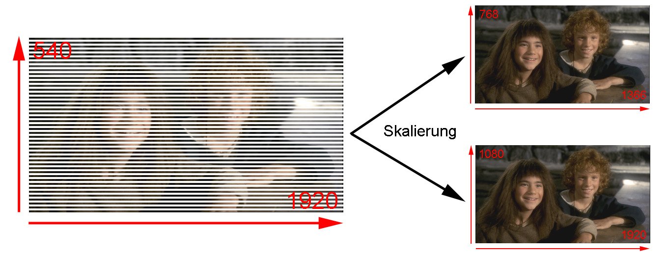 Jedes eintreffende Halbbild wird direkt auf die Zielauflösung skaliert, also die Auflösung des eingesetzten Displays (meist 1.366 x 768 oder 1.920 x 1.080). Problem: Ein Halbbild hat die volle horizontale Auflösung verglichen mit dem entsprechenden Vollbild (ausgehend vom Filmmaterial), aber natürlich nur die halbe vertikale Auflösung.
