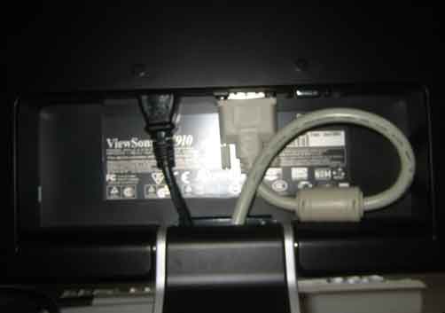 Naja, dann kam mein erstes (und bis jetzt einziges Problem). Für die Kabel muß man auf der Rückseite so eine Klappe aufmachen, da sind dann die Anschlüsse hinter, und wenn man die Kabel anschließt und die Klappe wieder draufmacht, kommen die Kabel unten raus. Sehr schön, sehr praktisch. Nur leider paßt mein DVI-Kabel, das ich zur Sicherheit vorher angeschleppt habe, nicht da rein. Weil zum einen das Kabel dicker ist als das mitgelieferte analoge und zum anderen dieser- äh - Knubbel? dieses dicke Stück, das an jedem Ende des Kabels ist (oje, vielleicht kriegt ihr jetzt eine Ahnung, wieso ich eigentlich keinen Bericht schreiben wollte?) - paßt nicht dahinter. Man kann es zwar quetschen, dann ist es aber komisch gequetscht und die Klappe geht nicht mehr drauf. Find ich nicht so schön. Keine Ahnung, ob ich ein blödes DIV-Kabel habe oder ob die immer so unpassend sind. Hab daher einfach das analoge Kabel genommen und das gute Stück angeschlossen. So.