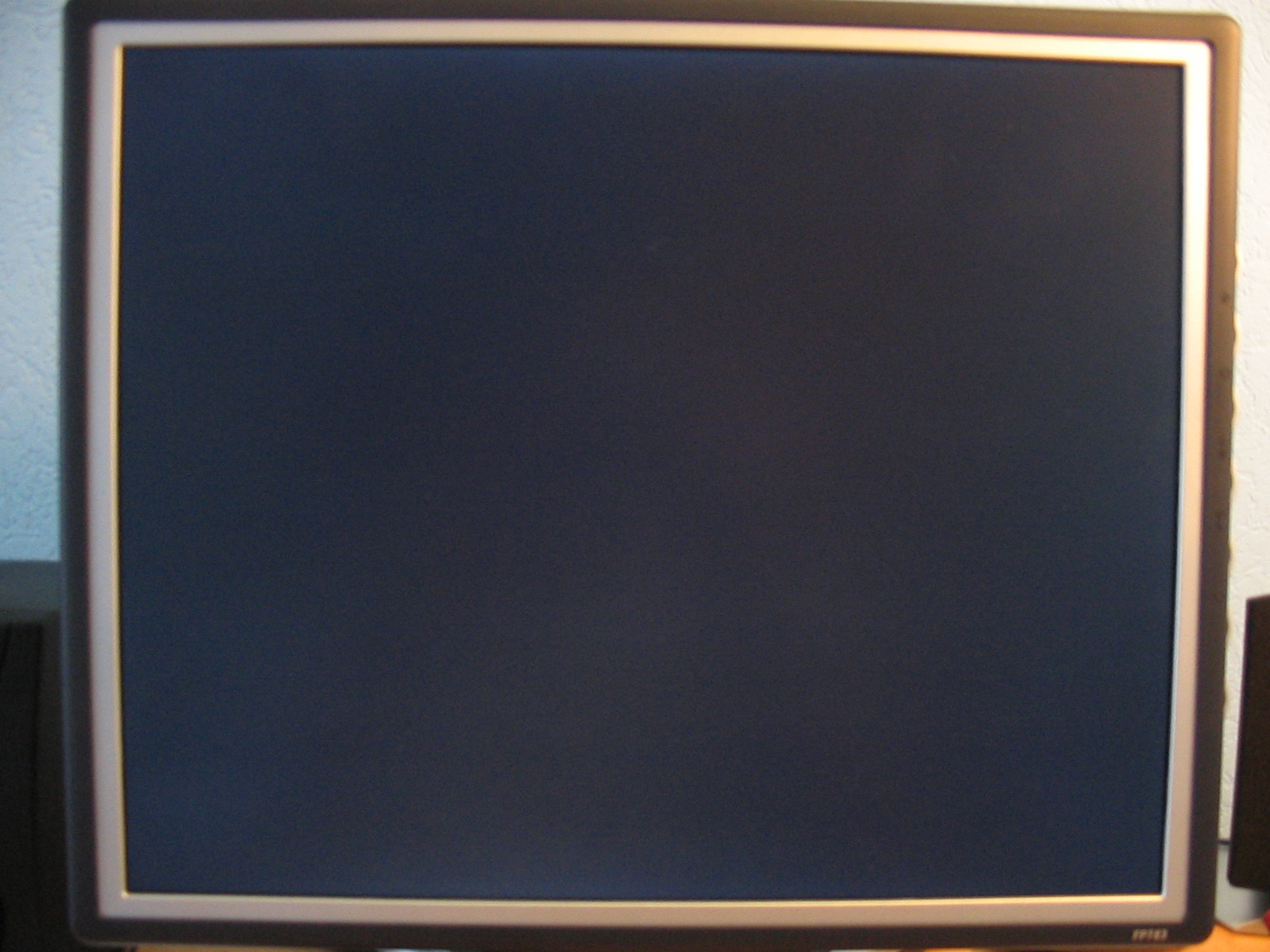 eingeschaltet und erstmal begeistert; keine Pixelfehler (der kleine schwarze Punkt links entpuppte sich als Staubkorn - puh, Glück gehabt; Ausleuchtung ist ok - unten und oben schimmert's etwas, ist aber nur bei vollkommen schwarzem Hintergrund wahrnehmbar, ansonsten absolut nicht störend;