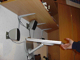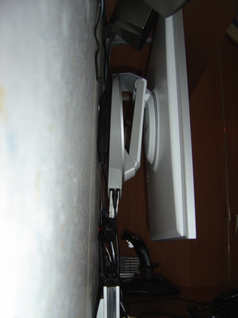 Der Arm des Monitors ist in fast alle Richtungen dreh und schwenkbar. Er ragt in einem Winkel von 45° vom Fuß ab und besitzt am Fuß sowie am Monitor ein Gelenk. Somit kann man den Monitor entweder im rechten Winkel zum Tisch oder parallel zum Tisch neigen. An der Rückseite des Fußes sind die Anschlüsse untergebracht. 1x VGA, 1x DVI und 1x Strom. Da diese allerdings parallel zum Tisch angebracht sind ragen diese nun in die Tiefe und vergrößern somit die Stelltiefe des Monitors erheblich. Gerade bei einem Stellplatz vor einer Wand oder Ähnlichem ist dies von großem Nachteil, weil man die Kabel schnell knickt, da der Monitor ja so nah wie möglich an der Wand stehen soll. Die „Höhenverstellung“ erfolgt ebenso über die zwei Gelenke und ist somit eingeschränkt. Da ich den Monitor allerdings eh an der Wand montiert habe kann man dieses Problem allerdings von vorn herein umgehen und ihn gleich in die richtige Höhe montieren.