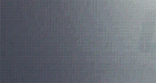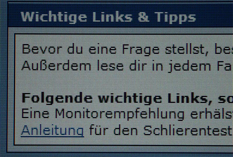 Das Pixelraster ist extrem sichtbar (siehe Bild). Sitzt man in einem Meter Entfernung, fällt es zwar nicht mehr so stark auf, aber das ist ja nicht Sinn der Sache. Gerade bei grauem Hintergrund oder bei dem blauen Hintergrund hier auf der Seite sieht man das extrem