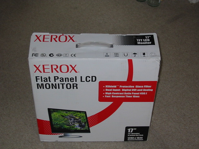 Der Xerox kommt in einem Winzigen Karton mit Tragegriff. Der ist so schön klein und flach, der eignet sich perfekt um dem Monitor z.B. auf LANs zu transportieren.