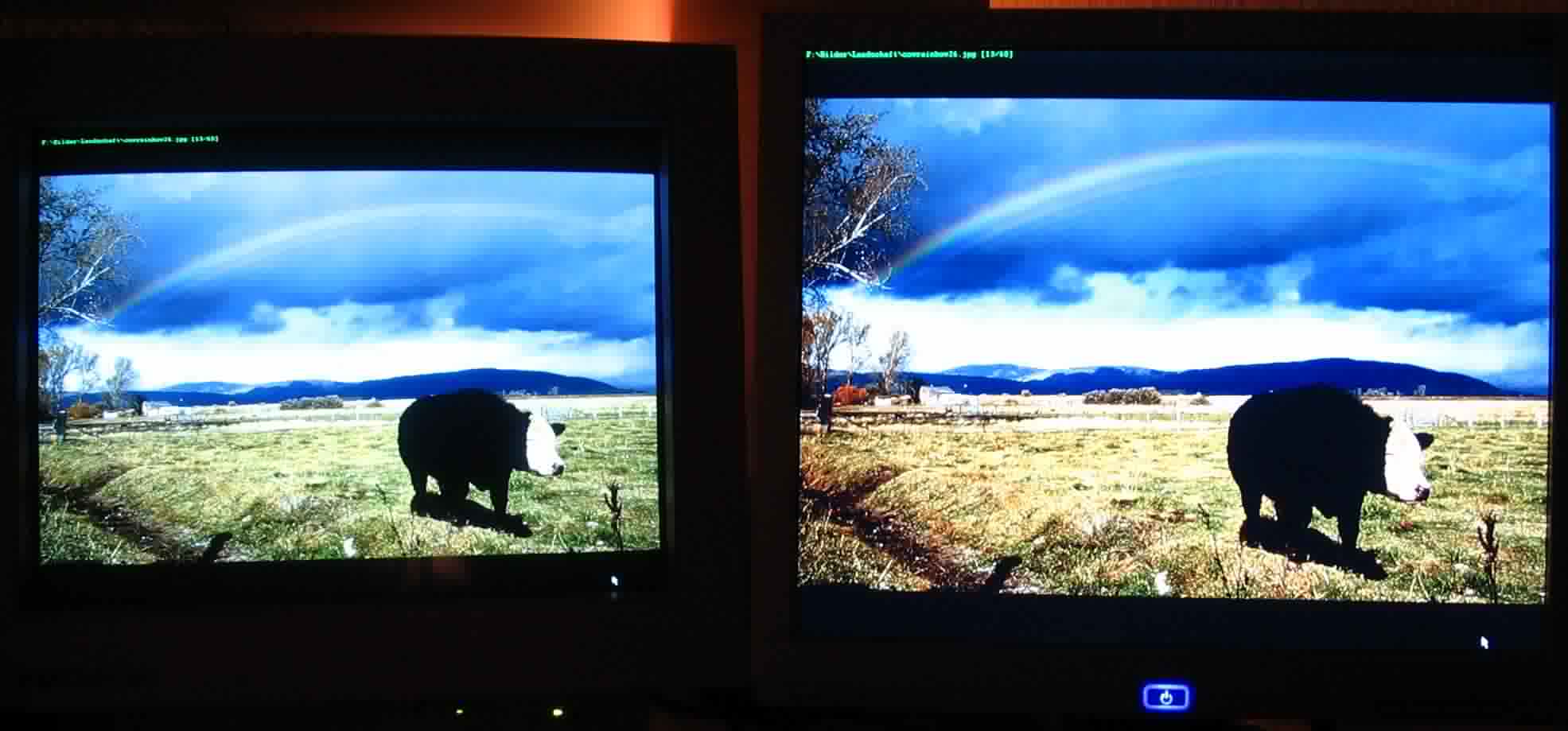 Bilder: Die Farben sind kräftig und gut, im Vergleich zur Röhre sogar etwas besser ausgeprägt (nun ist mein Eizo ja auch schon ca. 7 Jahre alt, aber immer noch sehr scharf). Die Winkelabhängigkeit spricht vermutlich für ein TN-Display: Seitlich gibt es kaum Probleme, ein leichter Stich ins gelbliche, wenn man schon extrem seitlich darauf guckt. Oben/unten ist jedoch der Unterschied sehr stark, nach unten darf man kaum gehen, nach oben geht es immerhin noch ein bischen. Während eine weisse Fläche noch gleichmässig aussieht, fällt die Winkelabhängigkeit bei der pixperan-Gammakorrektur deutlich auf: Die Quadrate haben zum einen eine leicht andere Farbe als der Hintergrund (ebenso beim Laptop, fast gar nicht beim FSC 19-1a), zum anderen kann man die gleiche Helligkeit nur für jeweils eine Zeile einstellen, die anderen scheinen winkelabhängig schnell verschieden hell. Dieses fällt aber wirklich nur bei diesem Gamma-Test auf, vielleicht weil ich es durch Laptop gewöhnt bin.