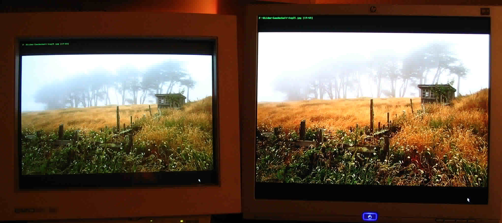 Arbeite seit knapp einem Jahr dienstlich viel mit Fujitsu-Siemens Laptop und 21" Monitor, zuhause mit 17" Eizo F563T. Vor zwei Wochen wurde der 21" durch einen FSC 19-1a (19") ersetzt. Als Vorbereitung habe ich gestern die wesentlichen Testprogramme auf Laptop und FSC 19-1a laufen lassen, kann also vergleichen.