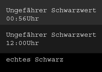 • Im übrigen geht es bei der Thematik einer sekundären Lichtquelle nicht darum, dass einem das schwarz (dunkelgrau) wie schwarz vorkommt, sondern ist eher als Schutz für die Augen gedacht, damit der Kontrast, den die Augen zwischen der dunklen Umgebung und dem verhältnismässig hellen Bildschirm einfacher überwunden werden kann.