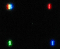 Pixelfehler: "Echte" Pixelfehler habe ich nicht gefunden, erst eine akribische Suche förderte ein "schwaches Pixel" zutage, das kaum sichtbar (so ab ca. 15cm Abstand) grün leuchtet. Auf dem zweiten Bild unten (ca. fünfmal größer als das Original) wirkt es wegen der relativ langen Belichtungszeit schlimmer als es ist, auf dem dritten ist es kaum zu erkennen, die Wahrheit liegt irgendwo dazwischen und deutlich näher an Bild Nummer 3. Zum Vergleich habe ich drummherum ein Viereck aus je einem weißen, roten, grünen und blauen Pixel gemalt.