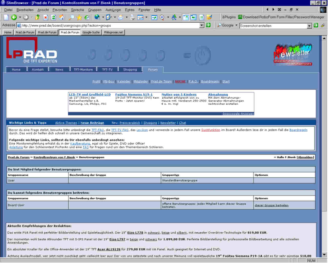 Ich habe gerade mal in meinem Profil gestöbert und gesehen, dass es scheinbar verschiedene "Benutzergruppen" gibt. Ich bin "User" und könnte der Gruppe "Boarduser" beitreten.