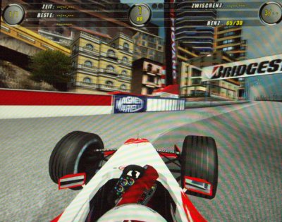 Als ich vorher an dem 25ms-Samsung saß, sind mir beim Spielen von UT2003 erst einmal keine Schlieren aufgefallen - vielleicht auch, weil dort geringere Farbkontraste als bei F1 zu finden sind. Mir ist das erst bei dem F1-Spiel aufgefallen, als eine dunkelgelbe Shell-Bandenwerbung auf grauem Hintergrund an mir eklig schmierend vorbeiglitt.