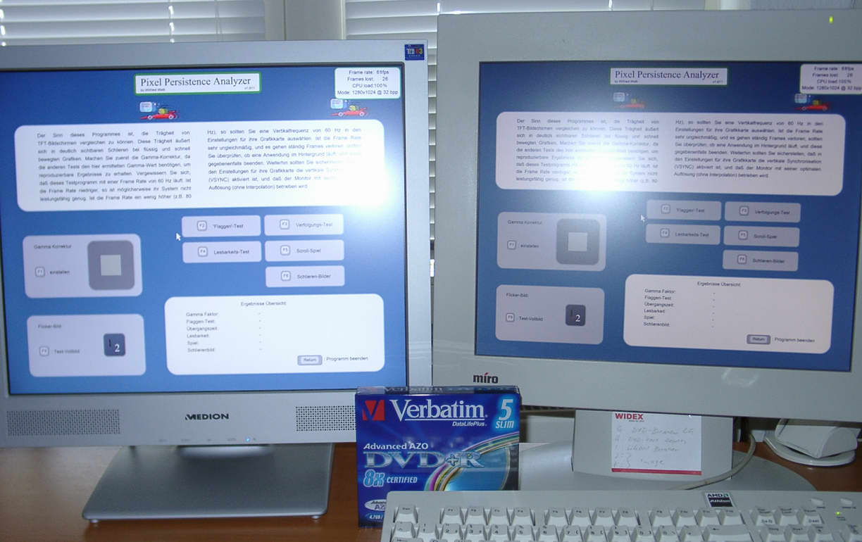 Die Gametests (CS, BF DC) und DVD gucken kommen dann auch auf´s gleiche Ergebnis. Wohlgemerkt hab ich mit dem Miro schon die letzten 3 Jahre gezockt und es störte mich auch in keinster Weise. Diesen hatte ich mir damals auch im MediaMarkt nach diversen Selbsttest (wo die Response eigentlich noch nirgends angegeben wurde) ausgesucht. Doch das ein 8ms nicht sichtbar besser ist, wundert mich dann doch etwas. Für mich heisst daß nur, auch die neuen 5 und 6 ms Displays werden nicht besser sein und die Angaben sind eigentlich für die Katz, weil über den gesamten Farbraum sind alle noch bei rund 25 ms, das zeigen ja auch die Kurven bei den diversen TH Test. Zum Verleich hab ich dann nochmal PixPerAN auf meiner 17" Iilyama Röhre laufen lassen. Hier kann man das "NEED MORE" in dem Roten Auto bis zum TopSpeed lesen, ebenso den Lesbarkeitstest auf Stufe 20 ! Das werden TFT´s wohl nie schaffen,