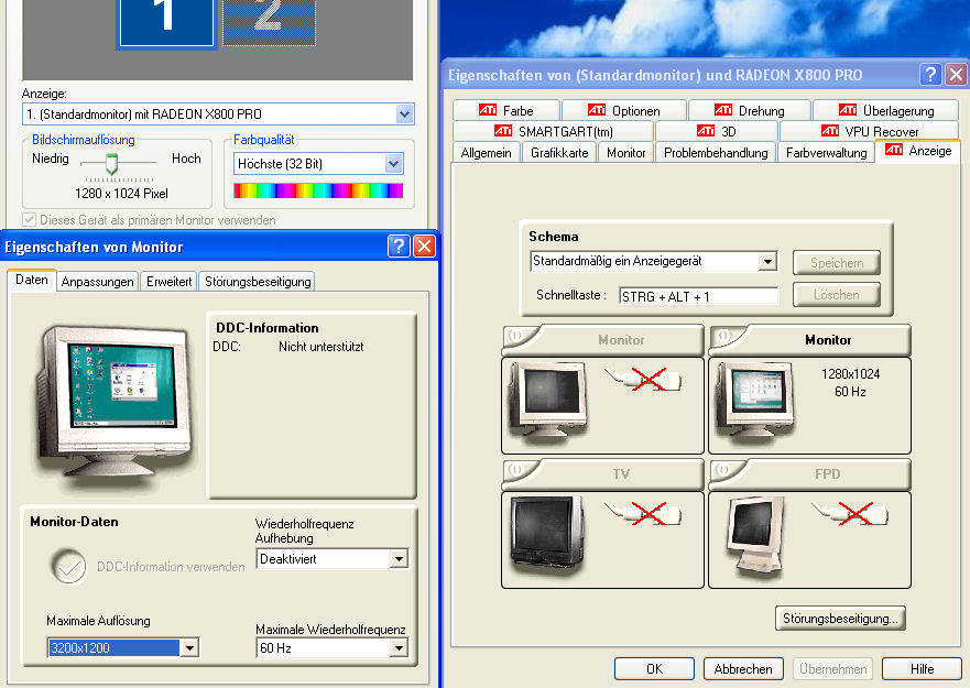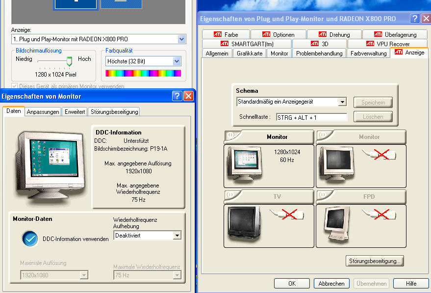 Mich interessiert brennend, ob diese Screenshots andeuten, dass mit meiner Karte etwas faul ist. Und ob hier überhaupt jemand einen P19-1A problemlos per DVI mit einer ATI X800 Karte laufen hat.