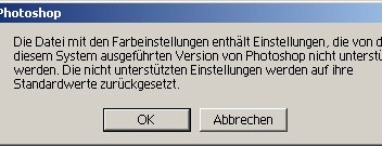 Kleines Problem hab ich noch, jedesmal wenn ich den Photoshop aufmache schreibt er mir ne Meldung hin! "Siehe Bild" Und wenn ich dann auf OK gehe macht er eh den Photoshop auf aber die Farben passen alle nicht! Weiß ist zb. einbisschen grün!