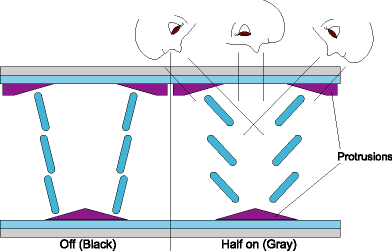 VA stands for 'vertical alignment' and is a term which is somewhat misleading because the LC molecules (in their static state) are not completely vertically aligned due to the protrusions (see above, Off, i.e. black state). When an electrical field is created by applying a voltage, the crystals are horizontally aligned and the back light can then pass through the various layers. MVA offers faster response times than IPS and TN+Film technologies which is an important factor for video and game performance. The contrast is generally better, however this can vary somewhat depending on the viewing angle.