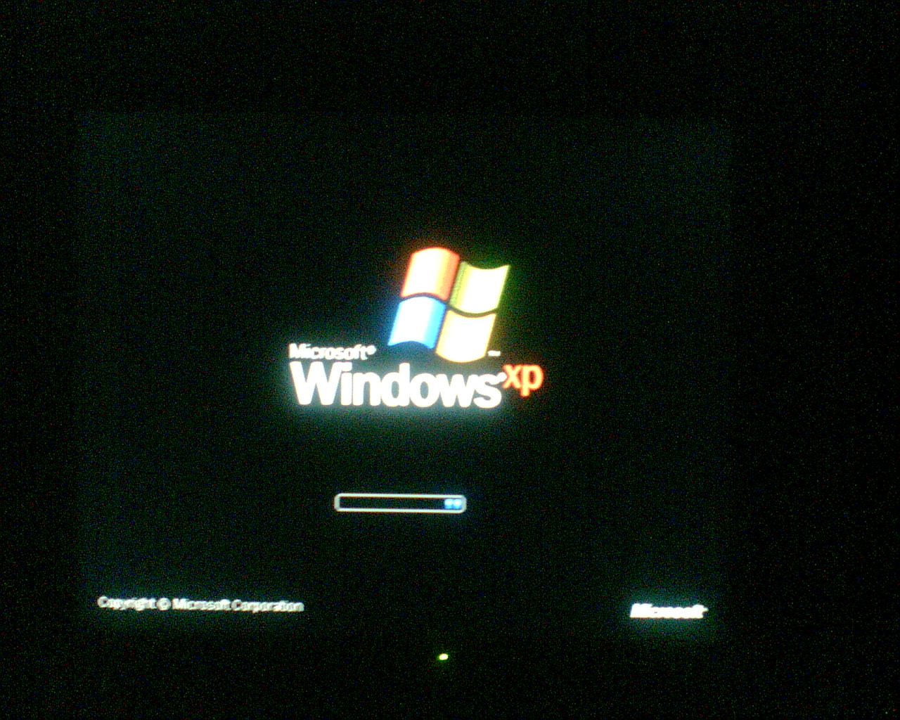 Ich habe noch ein Foto vom Windows XP Ladebildschirm angehangen. Wiederum bei völliger Dunkelheit, dieses mal bei 50% Helligkeit. Bei heller Arbeitsumgebung sieht man garnicht mehr, und dabei ist das Bild fast Schwarz. Ich erinnere außerdem nochmal daran, dass die Restlichtverstärkung der Kamera jedes Leuchten noch verstärkt bzw. überzeichnet. Normale Augen sehen dort also noch weniger! 8)