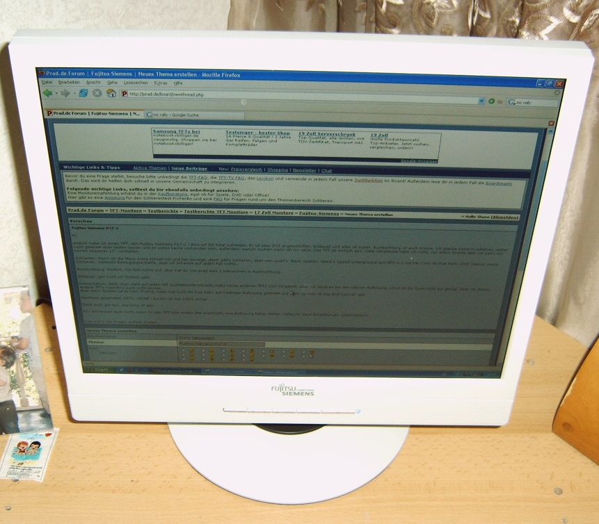 endlich habe ich einen TFT, den Fujitsu Siemens P17-2 ! Also ich bin total zufrieden. Er ist über DVI angeschloßen. Bildquali und alles ist super. Ausleuchtung ist auch klasse. Ich glaube keine Pixelfehler, selber nicht getestet aber testen lassen, außerdem warum suchen wenn ich nix sehe. Der TFT ist einfach geil. Viele Vergleiche habe ich nicht, vor allem direkte, aber ich kann mir keinen besseren 17'' TFT vorstellen.