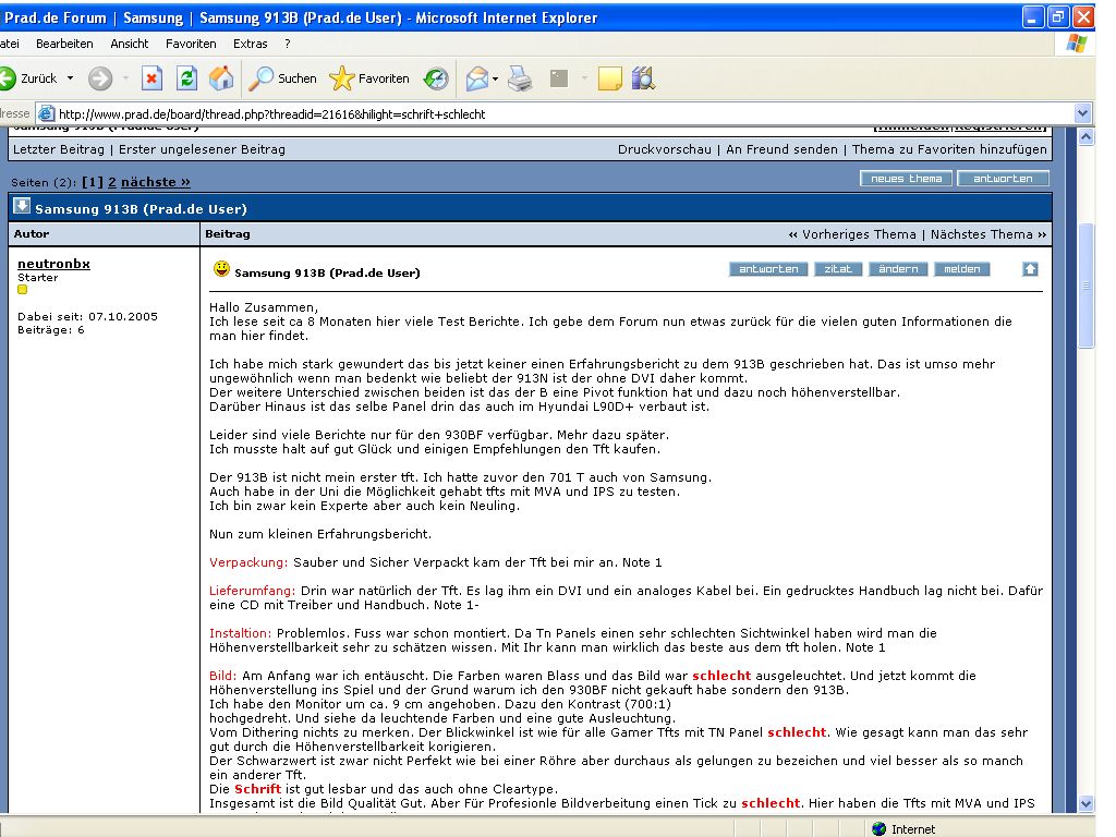 Ich hab schon öfters bemerkt, dass bei TFTs die Schrift schlechter ist als beim CRT. Mit schlechter meine ich, dass sie nicht fein und duchgängig ist (wie CRT), sondern hackig, mal dünner mal dicker.