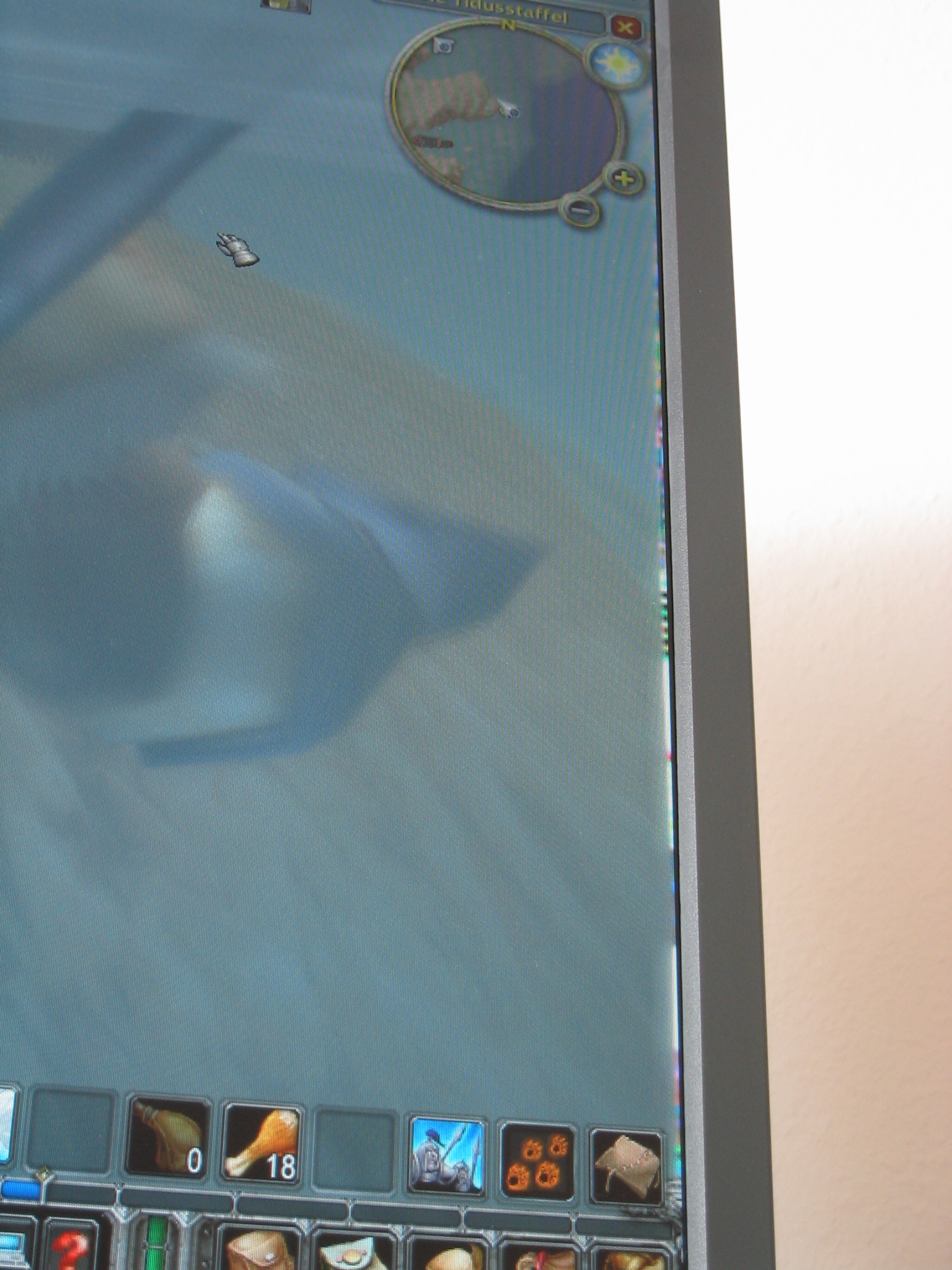 Ich bemerkte nun schon zum dritten Mal, nach etwa 1-2 Stunden in WOW in dunklen Räumen bzw. im Wasser folgende Erscheinung am rechten Bildrand. Von oben nach unten (oder umgekehrt) verläuft ein bunter Streifen. Dieser sieht je nach Hz-Zahl unterschiedlich aus. Lasse den Schirm auf 60Hz laufen. Habe mal Bilder angehängt. Werde auch mal mit dem Händler in Kontakt treten, denn das ist nicht wirklich schön bzw. so gewollt!