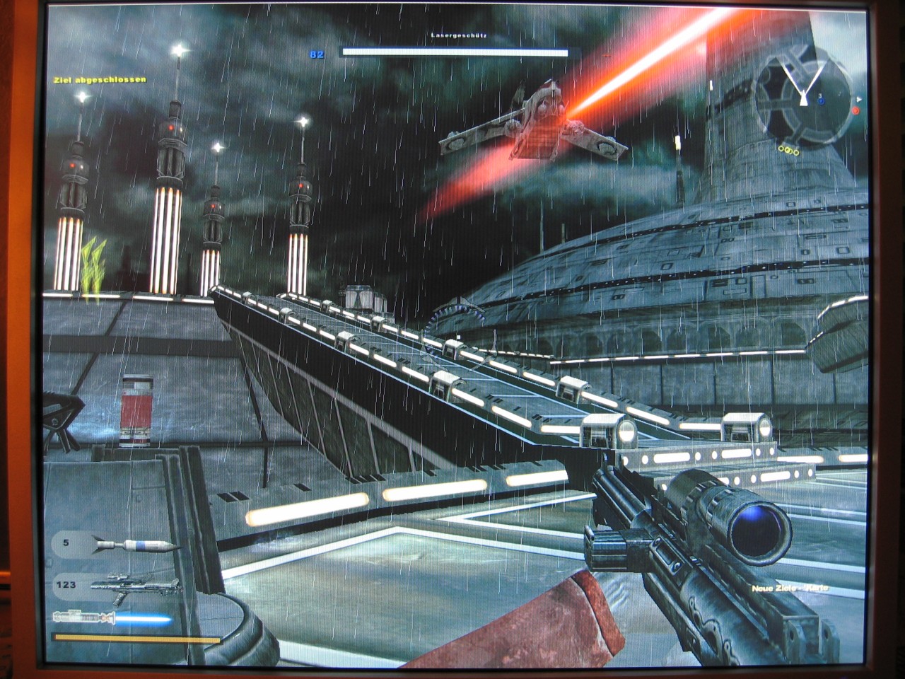 Hallo, anbei einige Screenshots. Da die DVI Grafikkartenschnittstelle am Wochenende den Geist aufgegeben hat, musste ich den Monitor an den Analogausgang anschließen, was die Bildqualität etwas verschlechtert hat. Die miese Fotoqualität bitte ich zu entschuldigen, aber eine Digicam ist nicht sehr gut zum Bildschirmabfotografieren geeignet. Daher auch die vertikalen Streifen, welche auf dem Monitor natürlich nicht zu sehen sind, die Farben sind leider auch nicht optimal wiedergegeben. Bezüglich der Bildschärfe kann man schon etwas mehr erkennen. Die Bilder sind von oben gesehen, dreimal STWBF2 und zweimal NFSMW und einmal schwarz mit Lichthöfen (etwas lange belichtet), zu mehr bin ich gestern abend nicht mehr gekommen.