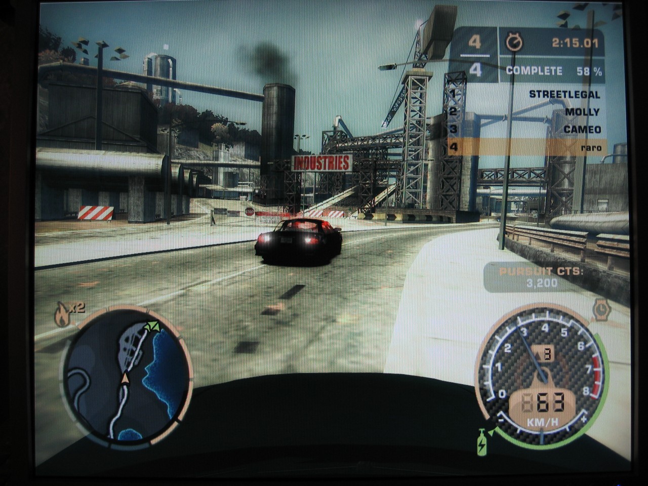 Hallo, anbei einige Screenshots. Da die DVI Grafikkartenschnittstelle am Wochenende den Geist aufgegeben hat, musste ich den Monitor an den Analogausgang anschließen, was die Bildqualität etwas verschlechtert hat. Die miese Fotoqualität bitte ich zu entschuldigen, aber eine Digicam ist nicht sehr gut zum Bildschirmabfotografieren geeignet. Daher auch die vertikalen Streifen, welche auf dem Monitor natürlich nicht zu sehen sind, die Farben sind leider auch nicht optimal wiedergegeben. Bezüglich der Bildschärfe kann man schon etwas mehr erkennen. Die Bilder sind von oben gesehen, dreimal STWBF2 und zweimal NFSMW und einmal schwarz mit Lichthöfen (etwas lange belichtet), zu mehr bin ich gestern abend nicht mehr gekommen.