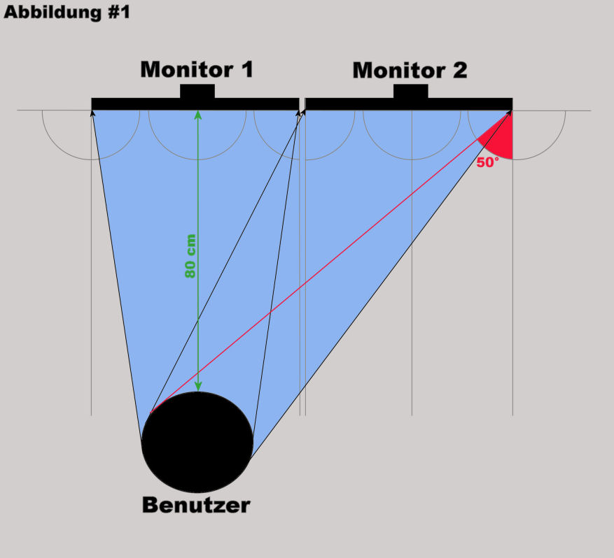 Der rot eingezeichnete Winkel stellt hierbei den maximal denkbaren Sichtgrad dar, der in dieser Sitzposition möglich ist: Von meiner äußeren linken Kopfseite zum äußeren rechten Rand des rechten Monitors.