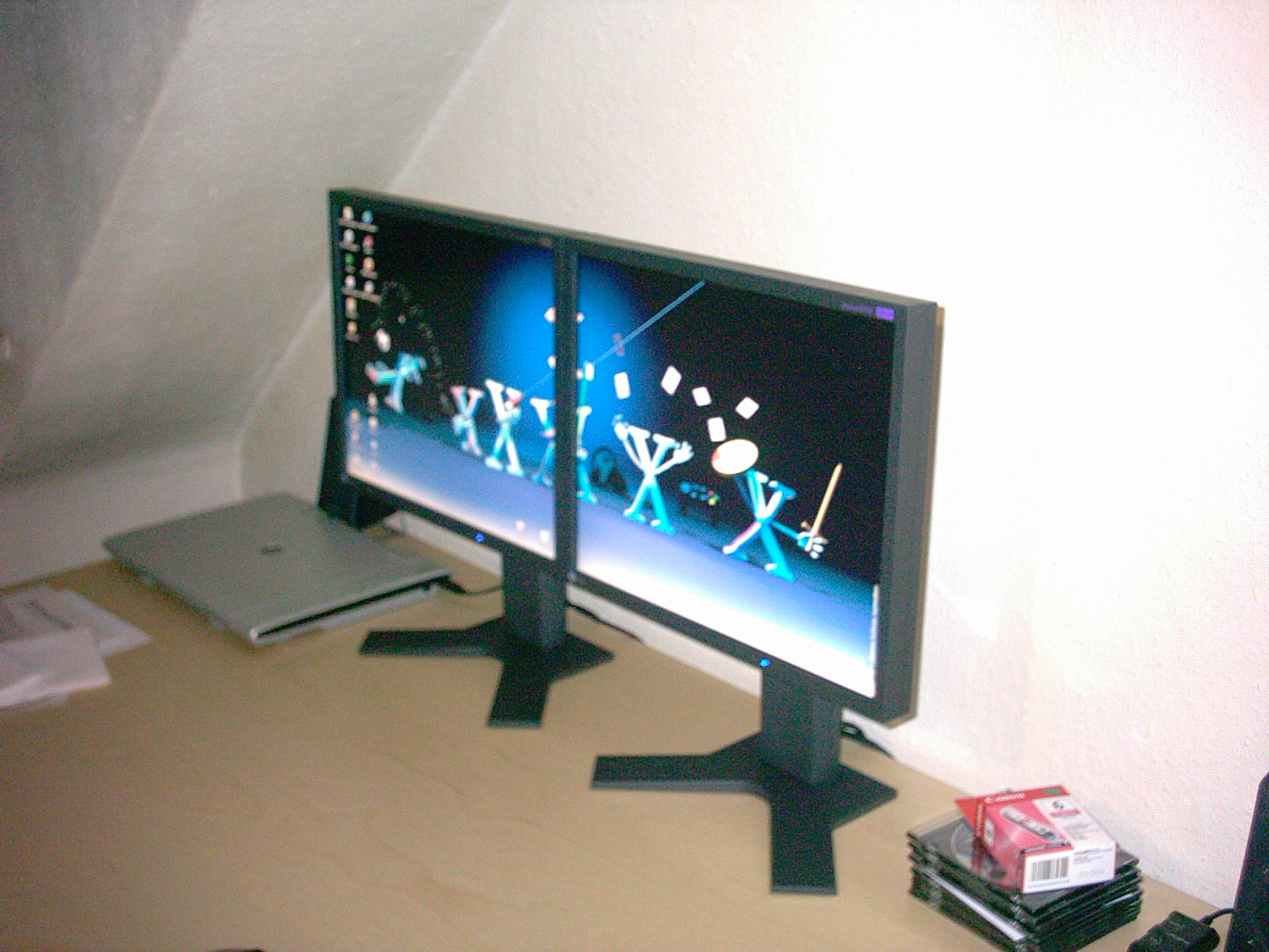 Ansonsten will ich hier nur noch ganz speziell auf den Zweischirmbetrieb eingehen, bei dem der Blickwinkel natürlich eine besonders große Rolle spielt, da man zumindest auf einen der beiden Monitore immer in einem etwas größeren Winkel schielt (jedenfalls dann, wenn wie bei mir, die Schirme nicht abgewinkelt, sondern exakt gerade nebeneinander stehen).