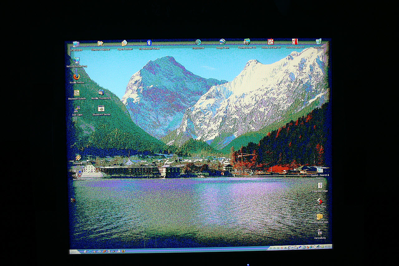 Bis Vorgestern Abend leistete er auch sehr gute Dienste, die mich keine Sekunde den Wechsel vom Iiyama Vision Master 450 Pro bereuhen ließen. Dann der Schock, ich komme von Arbeit, schalte Rechner und Monitor ein und ein vollkommen unbrauchbares Bild (siehe Anhänge) begrüßt mich. Offenbar kein Panel- sondern ein Elektronikfehler, da das OSD an beliebigen Positionen korrekt dargestellt wurde. Ein komplettes Zurücksetzen blieb erfolglos.