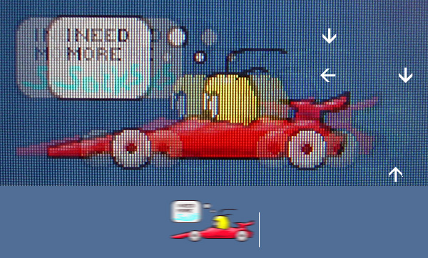 Mit PixPerAn gehe ich der Sache mal näher auf den Grund. Bereits am roten Wagen im Hauptschirm kann man sehr deutlich mit leichtem Abstand dahinter stets ein relativ scharf gezeichnetes Geisterfahrzeug sehen. Im Verfolgungstest bin ich schon entmutigt und klicke nur ein wenig hin und her, rund 30ms ist aber ein Wert den ich mir noch behalten konnte.