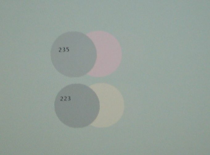 in dem fall wird ein rosa farbschatten geworfen. der effekt wird mit zunehemnder helligkeit verstärkt und hängt auch vom display mode ein wenig ab. bei bestimmten einstellungen kann der schatten auch mal grün statt rosa sein und bestimmte blautöne auf weissem untergrund machen ebenso probleme.