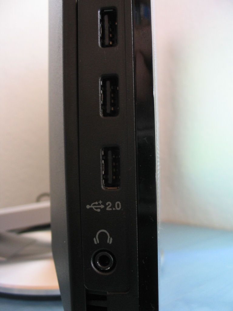 Die primären Anschlüsse sind verdeckt auf der Rückseite und stören somit das Gesamtbild nicht. Wenn das Display auf maximaler Höhe betrieben wird, kann man hier jedoch angeschlossene Kabel sehen, da diese dann leicht nach unten hängen. USB Anschlüsse und Kopfhörerausgang befinden sich auf der linken Gehäuseseite. Praktisch um zum Beispiel schnell eine Digitalkamera anzuschließen.