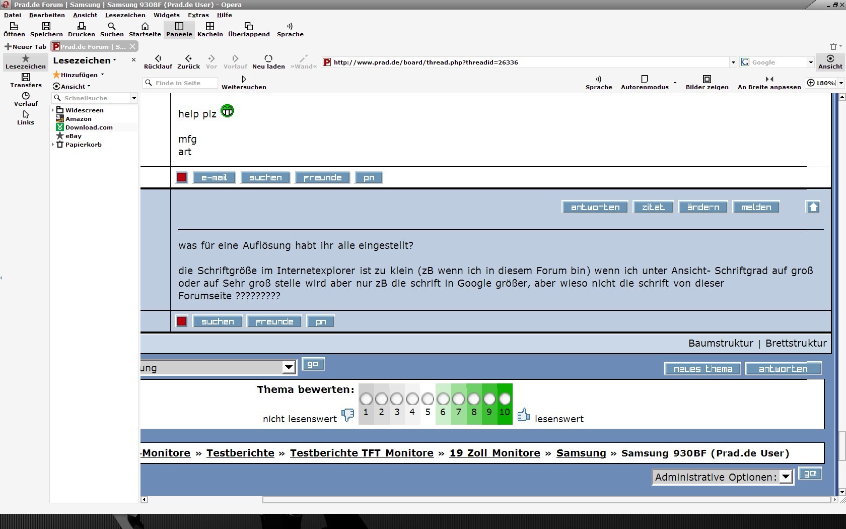 Es war mein allererster TFT Monitor, denn vorher hatte ich einen 17 Zoll CRT Monitor, mit dem ich immer sehr zufrieden war – sehr scharfes Bild, kaum Konvergenzfehler und die Geometriefehler hielten sich für einen CRT Monitor erstaunlich in Grenzen. Allerdings gab er leider nach einem lauten Knall den Geist auf, womit ich mich schweren Herzens entschloss einen TFT Monitor zu kaufen. Nach langen Überlegungen zwischen 17 Zoll und 19 Zoll, zwischen Samsung und Benq, entschloss ich mich für den Samsung 930BF. Eigentlich wollte ich einen 17 Zoll TFT kaufen, aber bei der für mich ungewohnt riesigen nativen Auflösung von 1280x1024 dachte ich, dass ein 19 Zoll Monitor besser sei, da ja dort die Schrift etwas größer dargestellt wird. Also kaufte ich ihn mir übers Internet.