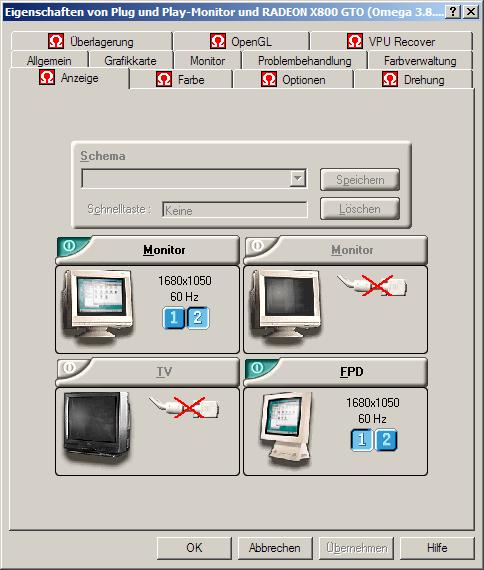 Im CCC wurde der zweite Monitor dann auch endlich erkannt (auf Anzeige erkennen klicken) und musste dann nur noch aktiviert werden. Mit dem Omega-Treiber und dem ATI Tray Tool habe ich leider keinen Erfolg gehabt, warum auch immer. Bisher war das damit auch kein Problem gewesen, zwei TFTs zu betreiben.