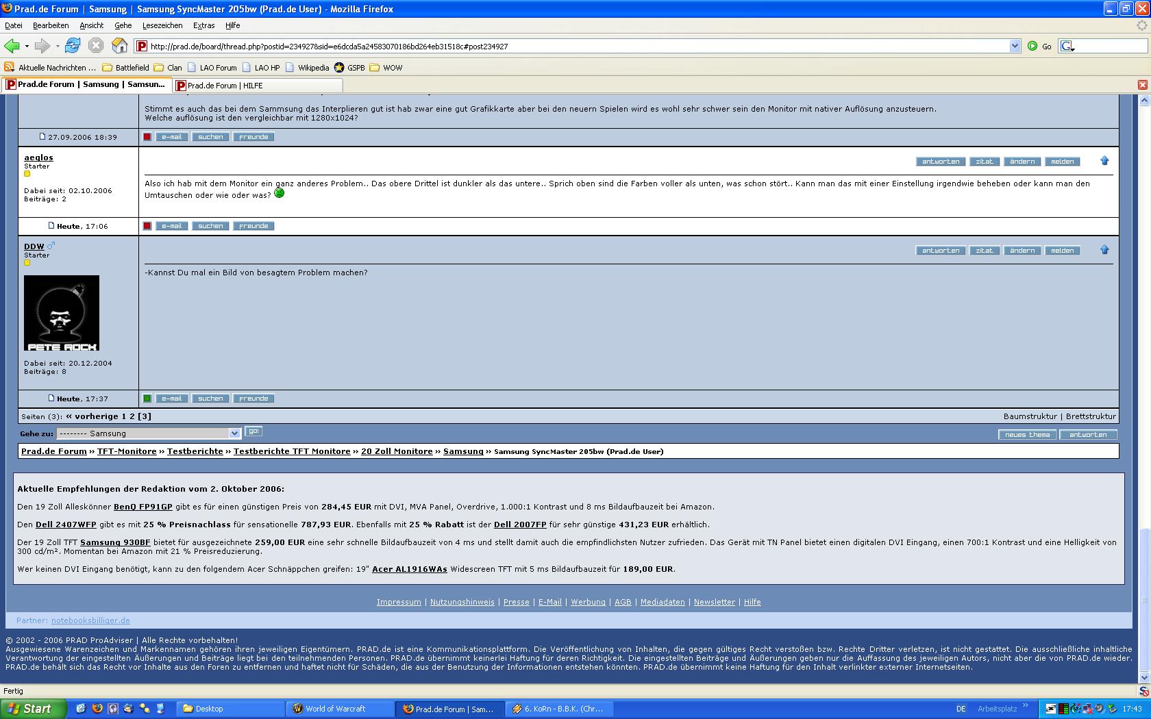 sonst ist der tft sehr gut. keine pixelfehler, gute ausleuchtung und sehr satte farben. aber da ich den monitor zum zocken brauche ist er nicht geeignet. auch mit den neusten treibern gabs kene verbesserung...naja...vielleicht weiss einer von euch nen tip