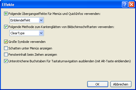 Jetzt aber noch ein anderer Aspekt: Ich besitze ein Notebook mit 15"-Panel und "SXGA+"-Auflösung (1400 x 1050), was eigentlich für diese Größe viel zu hoch ist -- entspricht ausgerechnet einem Dotpitch von 0,217 dpi. Aus diesem Grund habe ich unter Windows-XP unter "Anzeige -> Einstellungen -> Allgemein" eine Einstellung von "Groß (120 dpi)" gewählt (siehe Abbildung). In Kombination mit der Kantenglättung ClearType erreichbar unter "Anzeige -> Darstellung -> Effekte" ergibt sich für die Windows-Standardeinstellungen nicht nur eine passende Größe der Icons, Buttons etc., sondern auch eine perfekte Schriftdarstellung, ob im Office-Programm oder im Texteditor -- einfach grandios! =)