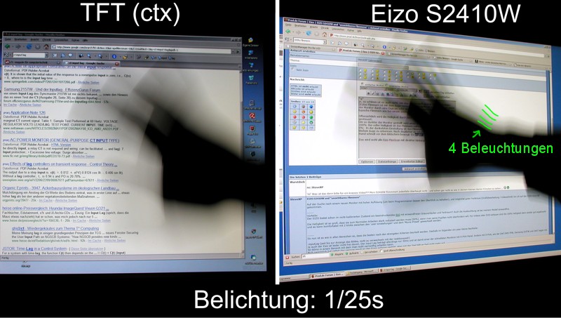 Im Gegensatz zu herkömmlichen TFTs flimmert dieser Monitor vergleichbar wie einige Leuchtstoffröhren mit 100Hz. Die Frequenz ist für das Auge natürlich nicht als Flimmern zu erkennen, aber ich hab das Gefühl, dass es auf die Dauer anstrengend ist auf den Monitor zu schauen, ob das daran Liegt oder an dem minimalen 'glitzern' kann ich nicht sagen...