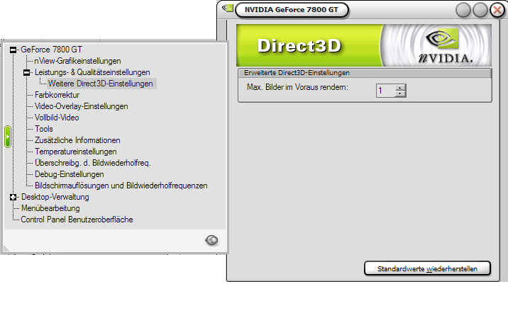 Es gibt aber tatsächlich eine Grafikkarten-Einstellung, die man optimieren kann. Die Grafikkarte berechnet nämlich mehrere Bilder im Voraus, während sie das aktuelle anzeigt. Da sie genauso wie Overdrive nicht in die Zukunft sehen kann, muss sie dafür natürlich schon die nötigen Informationen haben und puffert entsprechend viele Bilder zwischen. Das Spiel ist also evtl. schon weiter, als die Grafikkarte anzeigt. "Evtl." deshalb, weil es sich auch hierbei um einen Maximalwert handelt. Standardeinstellung bei Nvidia-Karten sind 3 Bilder bei DirectX und 2 Bilder bei OpenGL. Bei OpenGL kann man keinen niedrigeren Wert einstellen, bei DirectX berichten aber einige Leute von flüssigerem Spiel. Zumindest unter dem Windows Desktop kann man das leicht nachvollziehen. Stellt man den Wert sehr hoch ein, bemerkt man deutlich den Lag (der Mauszeiger reagiert deutlich später nachdem man die Maus bewegt). Ein Wert von 1 oder 2 ist hier ganz gut, 0 dürfte zu Einbrüchen bei der Framerate des Spiels führen. Einfach mal selbst probieren.