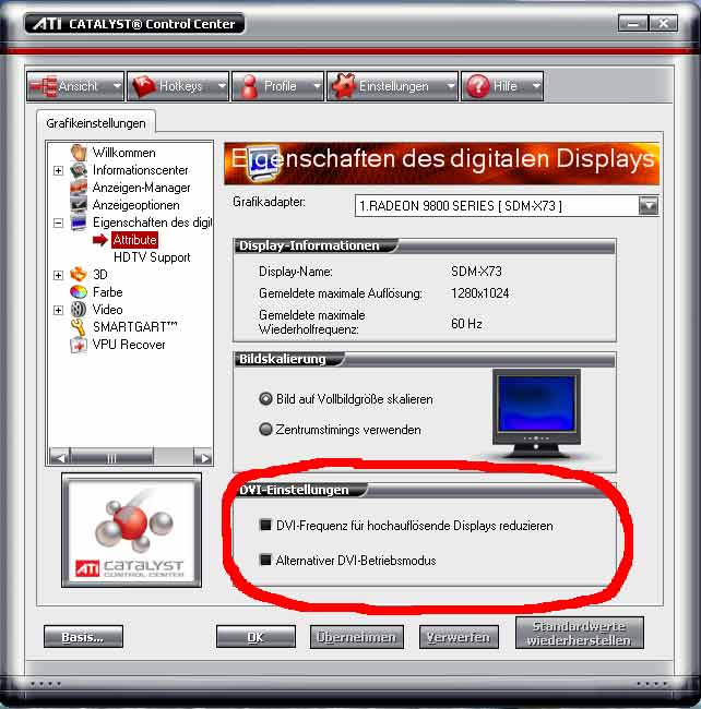 Es lässt sich nur die Auflösung 1280 x 1024 einstellen. Wenn ich auf 1680x1050 gehe, und dann auf "Übernehme" klicke, bleibt der Flat schwarz, und nach etwa 10 sek. kommt der Bildschirm wieder, aber wie gehabt in der 1280x1024er Auflösung.