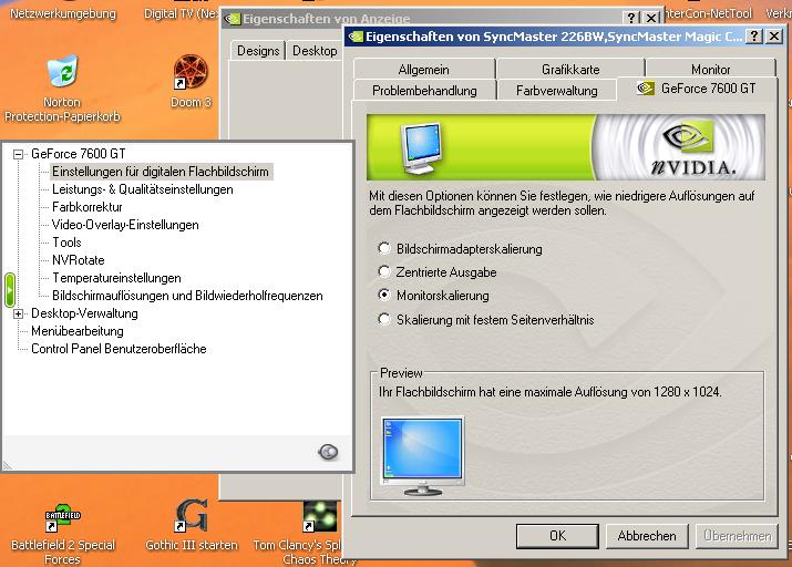 also hab folgendes Problem, wenn ich den Samsung 226BW über DVI anschließe, wird er nur mit eine Auflösung von 1280x1024 erkannt. Kann auch wenn ich ihn so angeschlossen haben keine höheren Auflösungen von Hand eintragen. Wenn ich aber dann eine Auflösung höher (Windows Standart Auflösungen wie 1600x1024) auswähle wird sie nur Virtuell dargestellt, also der Monitor behält seine Auflösung und ich kann dann das Bild hin und her schieben.