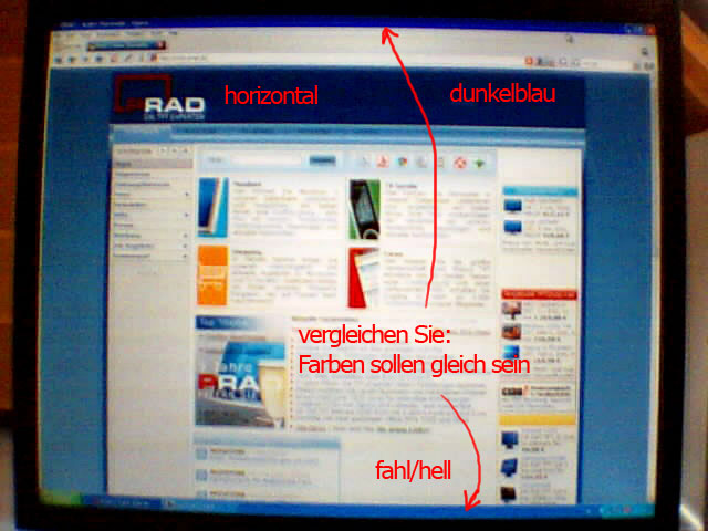 Eigentlich gefällt den Monitor mir ganz gut, wenn die Homogentität der Farbdarstellung nur in Ordnung gewesen war. Ich habe schon viele Falchbildschirme (auch TN) für Freunde gekauft, aber bei diesem Teil sind die Farben oben besser als unten (siehe Bild, mehr im genannten Thread). Die Start-Taste ist fahl. Vielleicht gibt es ein Problem bei der Beleuchtung.