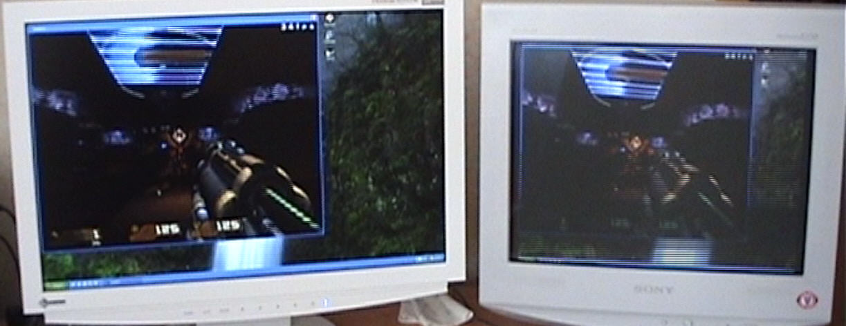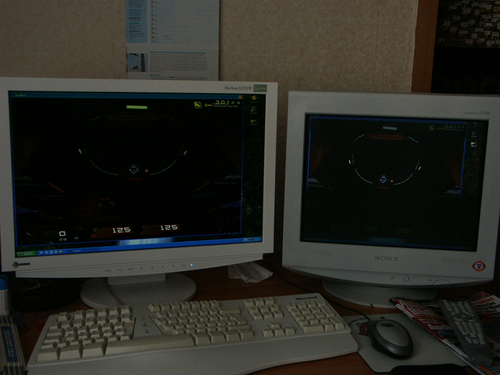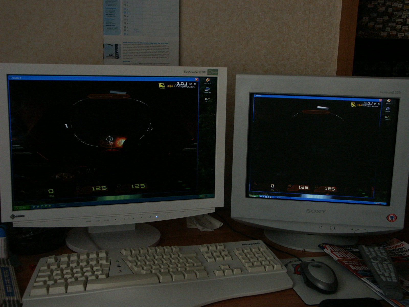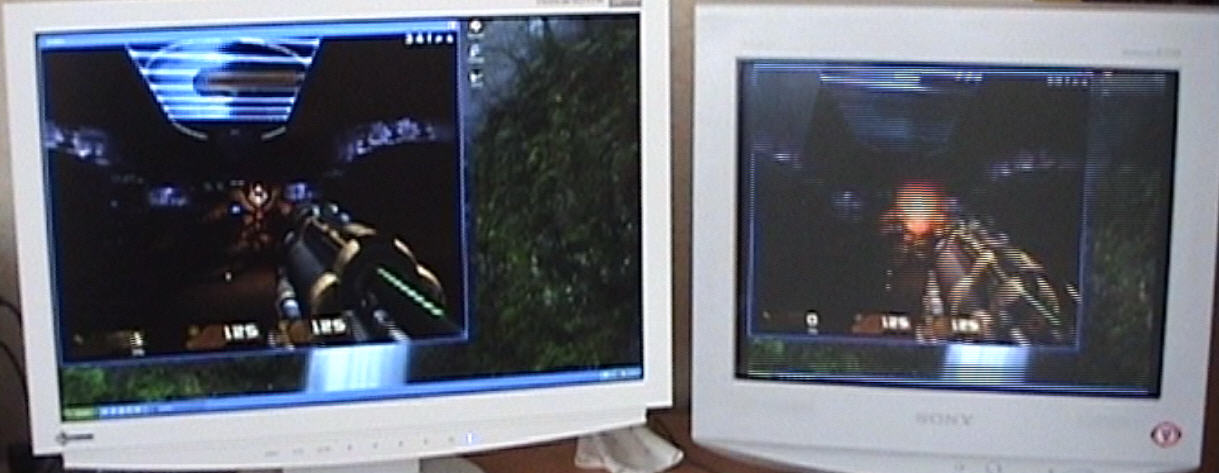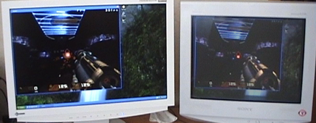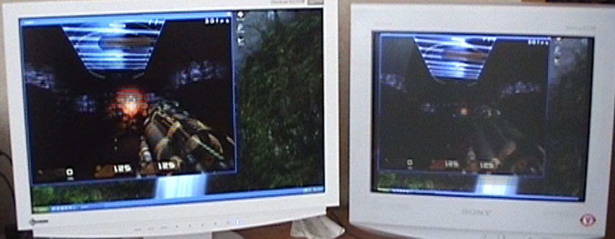 • Die Verzögerung ist da, aber es kann zu Schwankungen in der Messung kommen, zumal eine Videokamera 25 Bilder/s aufnimmt, während die Monitore mit knapp 60 Hz laufen (der Eizo mit 59,8 ). Bei Nvidia Karten kann man manuell die Timing Formula für beide Ausgänge im Klonmodus angeben. Wenn man dort die gleiche Formel für TFT und CRT bei gleicher Auflösung wählen kann, dann ist das schonmal besser für die Messung. Unterschiedliche Formeln sorgen nur für einen sehr kleinen Unterschied von unter 1 ms, aber führen zu Problemen bei der Messung (z.B. regelmäßige Ruckler/Aussetzer auf einem Gerät gegenüber dem anderen). Zudem baut der TFT das Bild ebenfalls von oben nach unten auf, so dass es sein kann, dass beide Geräte nur ein halben Bild voneinander entfernt liegen, man aber meint es wäre schon ein ganzes.