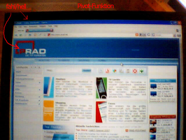 - Horizontales Bild: der Hintergrund des Titels ("Prad - Opera") ist dunkelblau und scheint mir eine normale Farbe zu sein. Der Hintergrund neben der Start-Taste ist leichter blau. Das heißt, die Farben unten wirken abgewaschen. Im oberen Bereich des Displays sind sie besser.