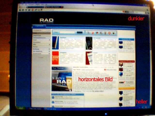 "In real life" sieht man ganz gut, dass die Hintergrundbeleuchtung unten heller ist als oben. Bis etwa ein Drittel der Oberfläche bleibt das Display wirklich heller. Das heißt, die Farben unten sind wirklich fahl (wenn ich kleine "color profiles" verwende). Mehr Informationen und Fragen stehen in den vorigen Posts.
