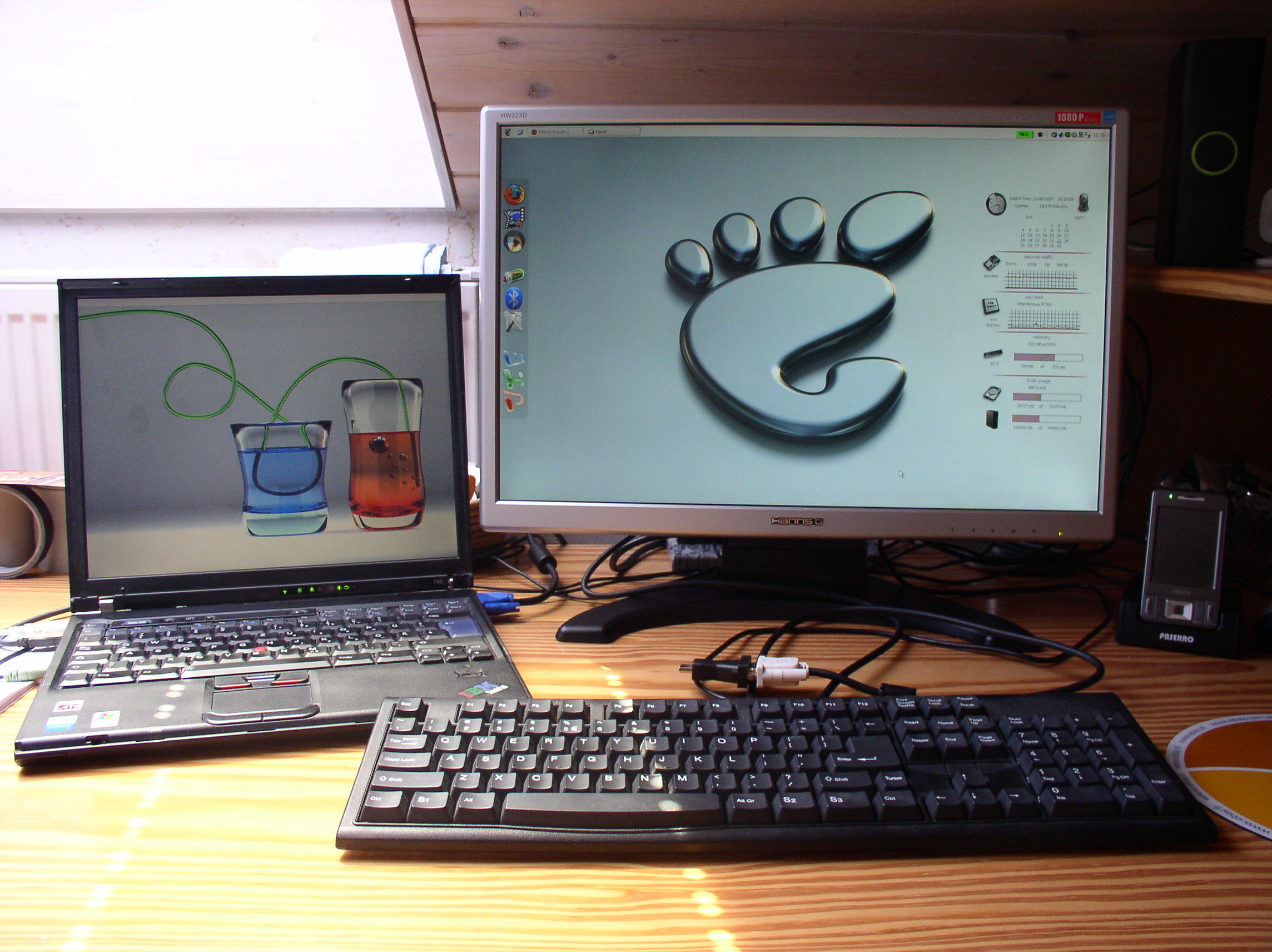 Aktuell ist er nur per VGA angeschlossen, da mein IBM T43 keinen direkten DVI Ausgang hat.