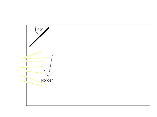 Ist der Strich mit 45° etwa Dein Schreibtisch/Computerstandort ? Und die gelben Striche sollen den Lichteinfall durchs fenster darstellen ?