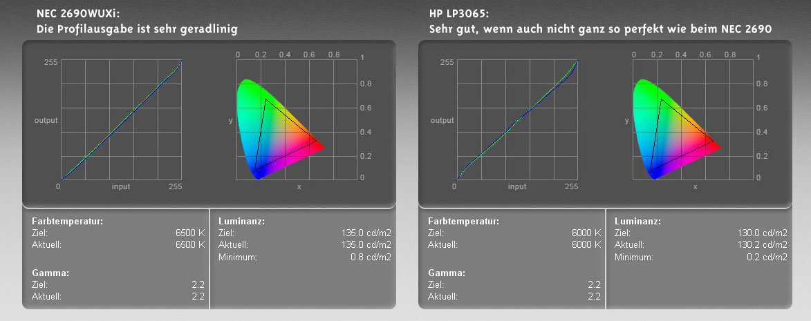 Das Ergebnis nach der Kalibrierung ist sehr gut und durchaus mit dem NEC 2690 vergleichbar: ein unbunter sauberer Grauverlauf und ein riesiger Farbraum, der etwa 90% des Adobe RGB abdeckt. Die Farbprofile beider Monitore sind in ihrem Umfang fast deckungsgleich. Im Diagramm der Ausgabekurve (Bildanhang) kann man sehen das der NEC 2690 sein Farbprofil geradliniger erzielt. Beim HP LP3065 ist für die Korrektur der Farbwerte ein kleiner Slalom nötig.