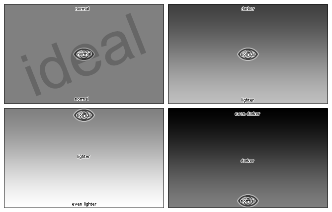 Ich habe ein Bild angefertigt, das den Effekt demonstriert. Dabei handelt es sich aber um rein konstruierte Helligkeitsverläufe, die so extrem bei dem Monitor nicht auftreten. Das Auge zeigt jeweils die Betrachtungsposition.