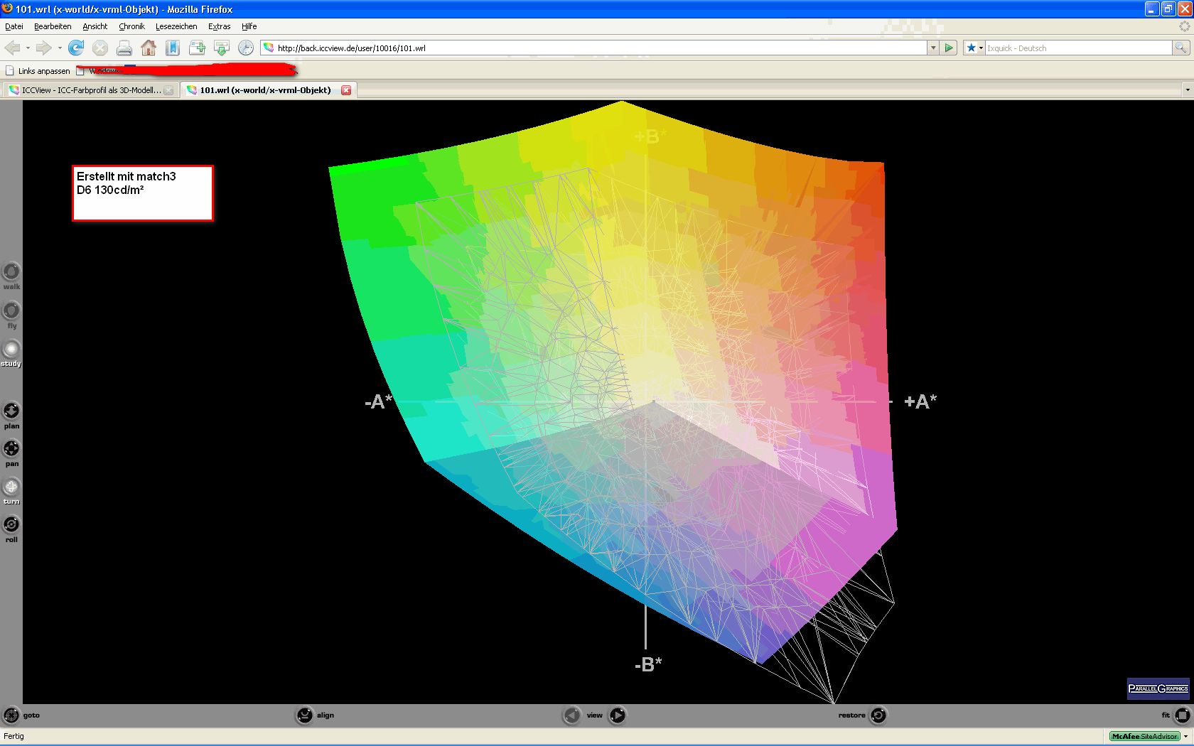Das Erste zeigt das von Eizo beigelegte D6 Profil, das Zweite ein von mir erstelltes D6 Profil. Beide im Vergleich zum sRGB- Profil, hier als "Gitter" dargestellt.