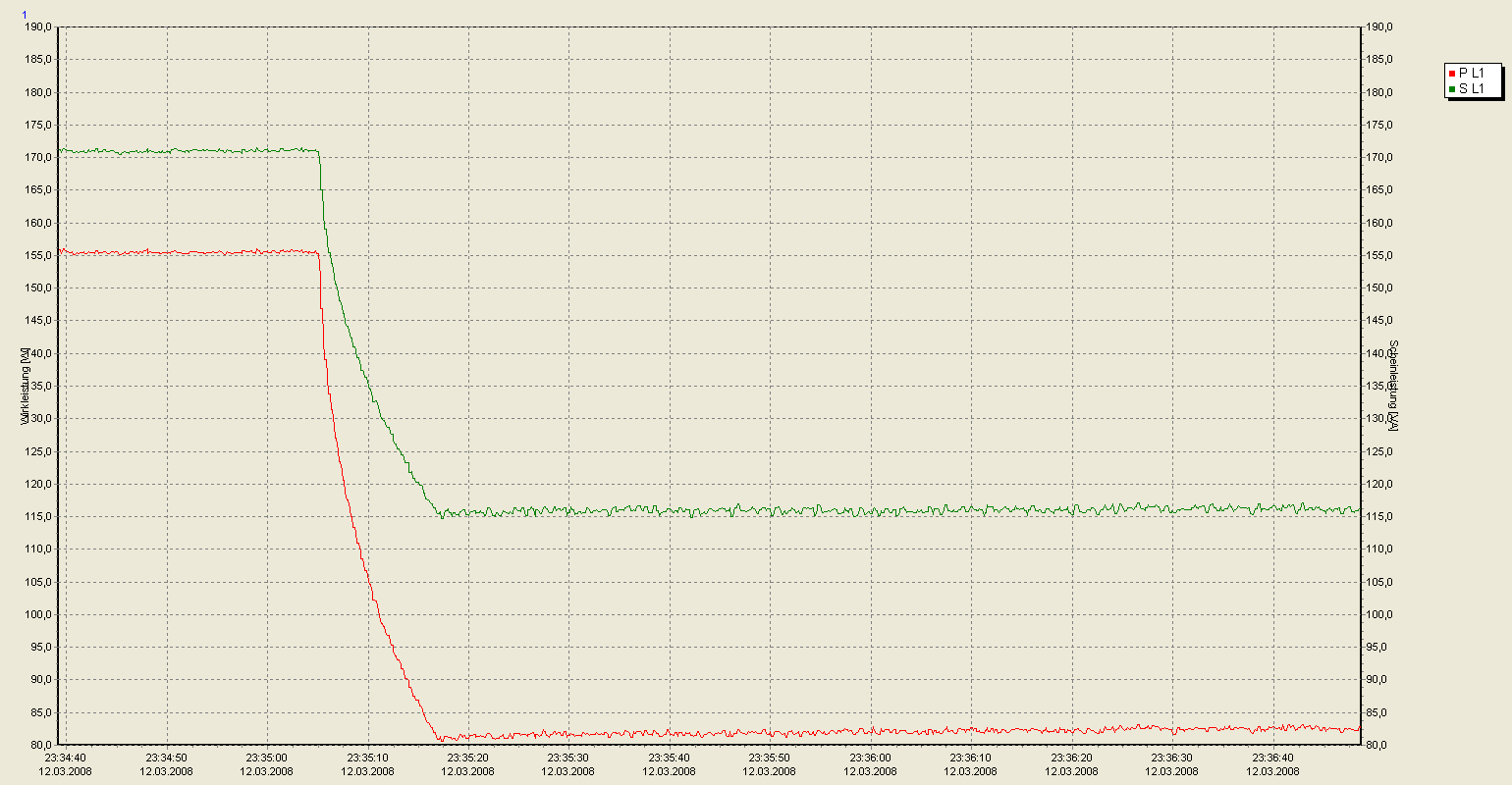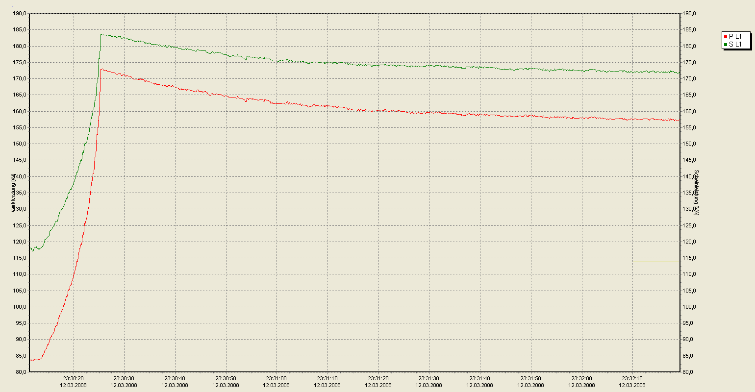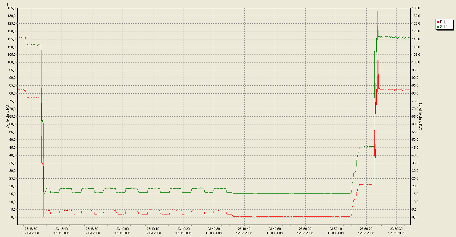 Achsen: links Wirkleistung, unten Zeit, rechts Scheinleistung