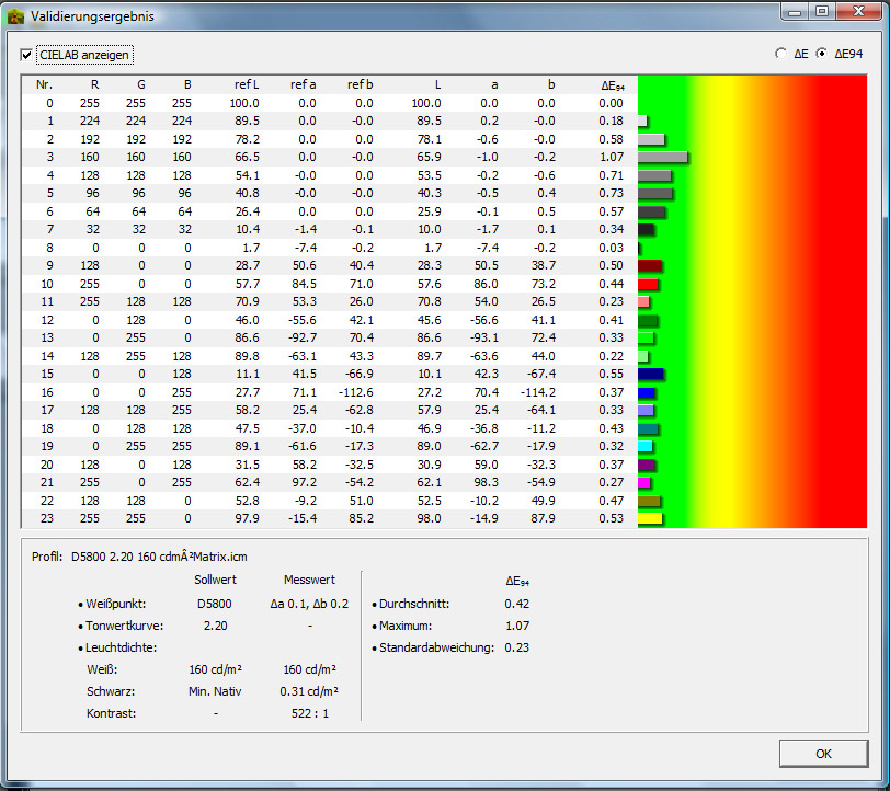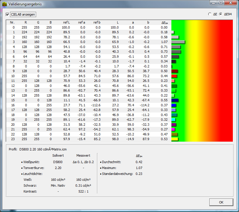 Nach dem ich dann aus denselben Grunddaten ein Matrixprofil erstellt (5800k, 2.2, 160cd) und es ins System integriert hatte sah alles schon sehr gut aus. Nur noch sehr leichte Streifen bei Grün, Gelb, Türkis und im Grauverlauf.