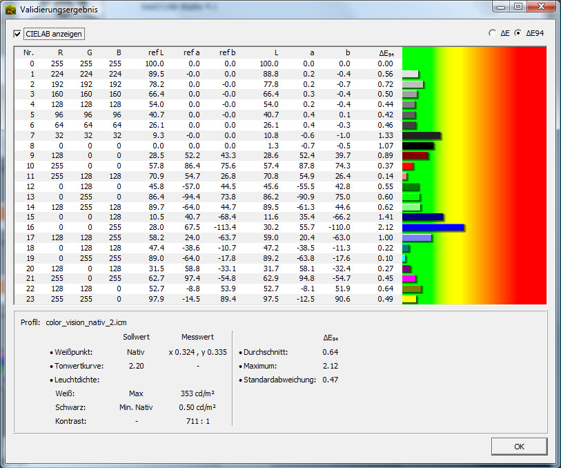 Jetzt sieht alles Top aus. Das Diagramm (ArgyllProfil) zeigte ja auch bei Schwarz und Blau die heftigsten Ausreißer. Meine Schlußfolgerung daraus ist, daß der Fehler nicht bei mir lag sonder der Spyder2 inkompatibel zu Basiccolor ist und Argyll mit dem Spyder2 wiederum recht gut klar zu kommen scheint.