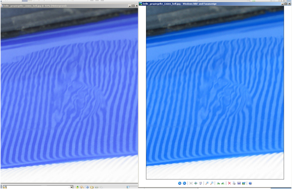 Angehängt ist ein Bild von einer kleinen Delle in meinem blauen Auto. Das ist nun zwar genau umgekehrt, aber es bringt einen ähnlichen Effekt.